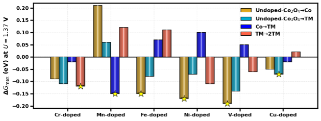 Description: Change in the limiting free-energy span dGₘₐₓ(U) at U = 1.37 V vs RHE for undoped and different TM-doped Co3O4 systems. Bars represent the effect of different doping configurations: Undoped-Co3O4->Co (gold), Undoped-Co3O4->TM (turquoise), Co->TM (blue) and TM->2TM (orange). Negative values correspond to a reduction in Gₘₐₓ(U), which indicates a promoting effect of the respective dopant. Stars highlight the most favorable site configurations for each dopant.