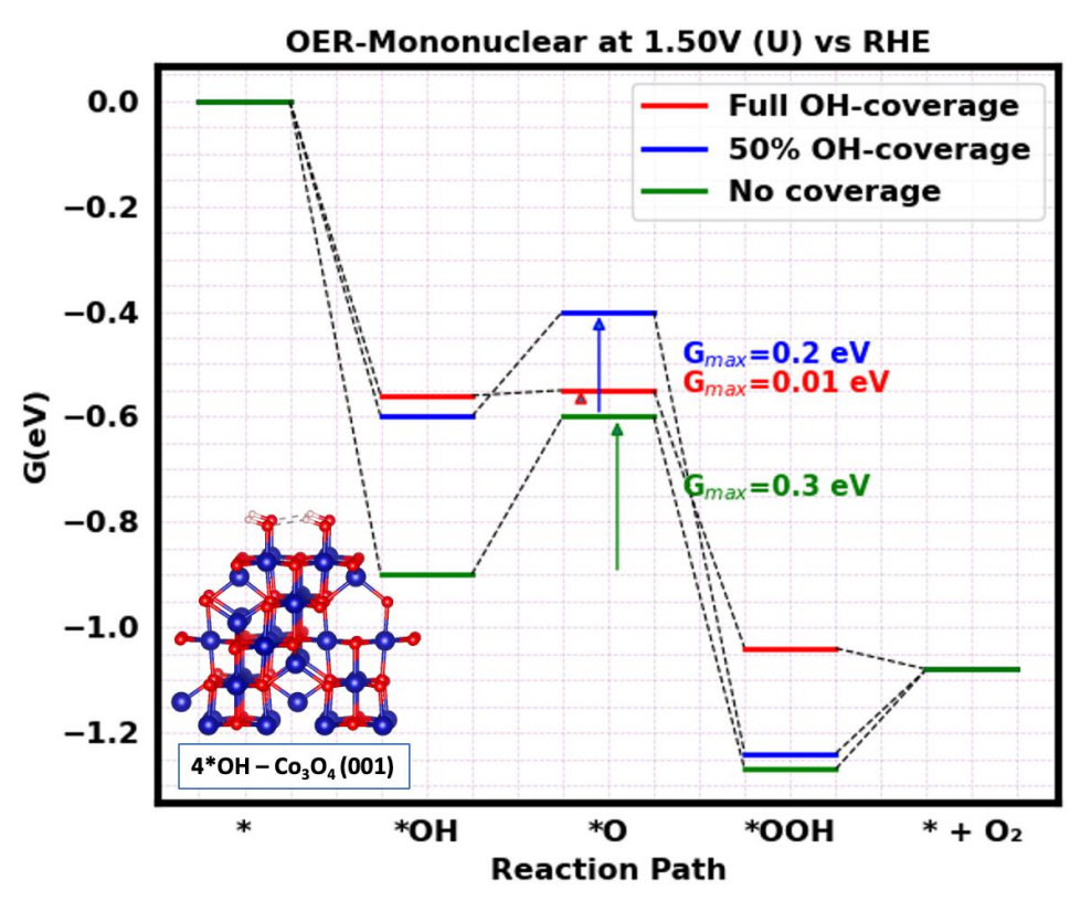 Description: Free-energy diagram at U = 1.50 V vs. RHE for different *OH coverages on Co3O4 (001) based on the mononuclear mechanism of the oxygen evolution reaction. Inset in the figure: Model for the 4 *OH surface used in the DFT calculations. Blue, red, and white sphere represent cobalt, oxygen, and hydrogen atoms, respectively.